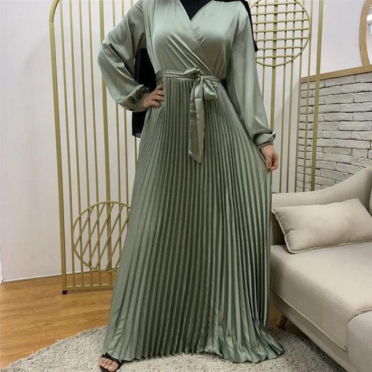 Fashionable V-Neck Stitching Gamis Muslim Women Pleated Long Dresses