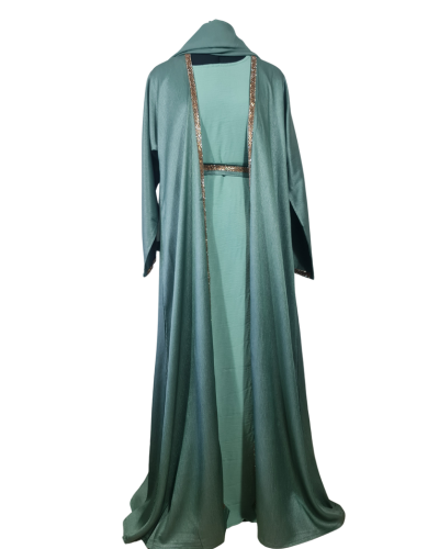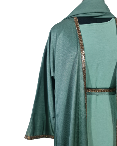 Discover effortless elegance with the Three-Piece Sarin Abaya Set. This luxurious ensemble includes a flowing abaya, a matching inner dress, and a lightweight hijab, giving you a complete, coordinated look for any occasion. The Sarin Abaya is crafted from high-quality, breathable fabric, offering both comfort and style, perfect for those who appreciate modest fashion with a modern twist.